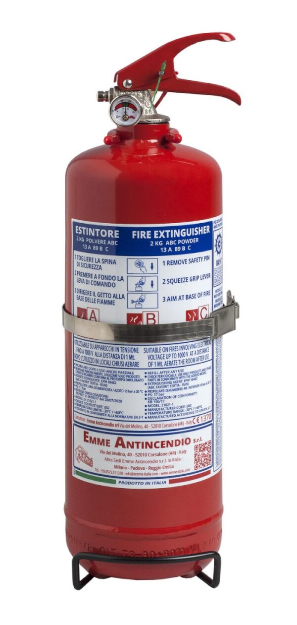 – 2 Kg powder fire extinguisher, temperature range from -30°C to +60°C, and certified according to the directive for pressure equipment. Manufactured according at productions checks agreed.